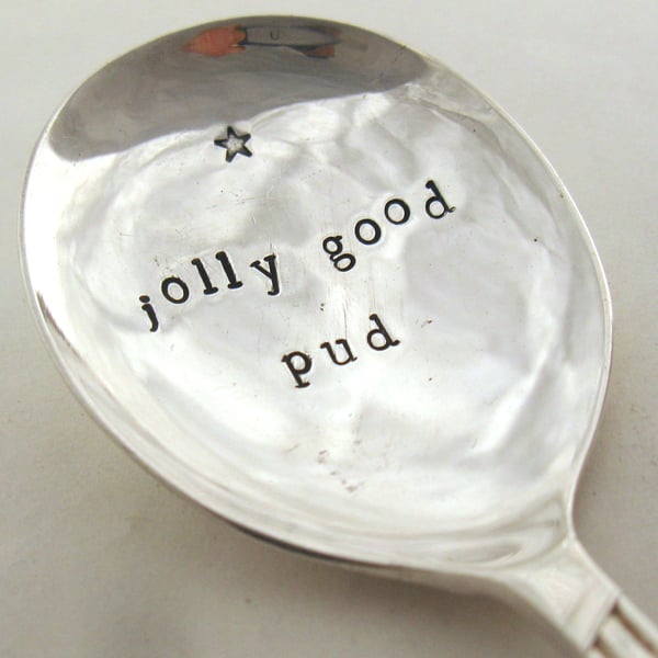 • Jolly Good Pud, Handstamped Vintage Fruit Spoon