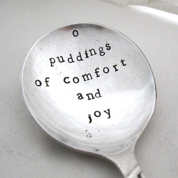 • O Puddings of Comfort and Joy, Handstamped Vintage Fruit Spoon