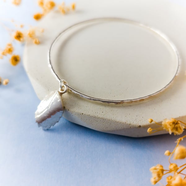 • Silver Bangle with Rose Leaf Charm - Recycled Silver - Stacking Bangle