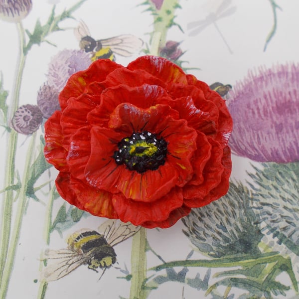 • RED FIELD POPPY BROOCH Wedding Corsage Remembrance Lapel Flower Pin HAND PAINTED