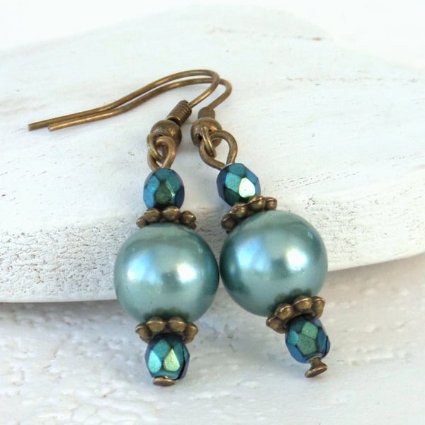 • Teal green shell pearl and crystal bronze earrings