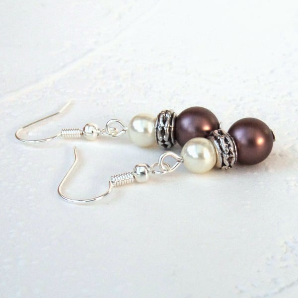 • Swarovski® crystal pearl earrings, with brown velvet and ivory crystal pearls